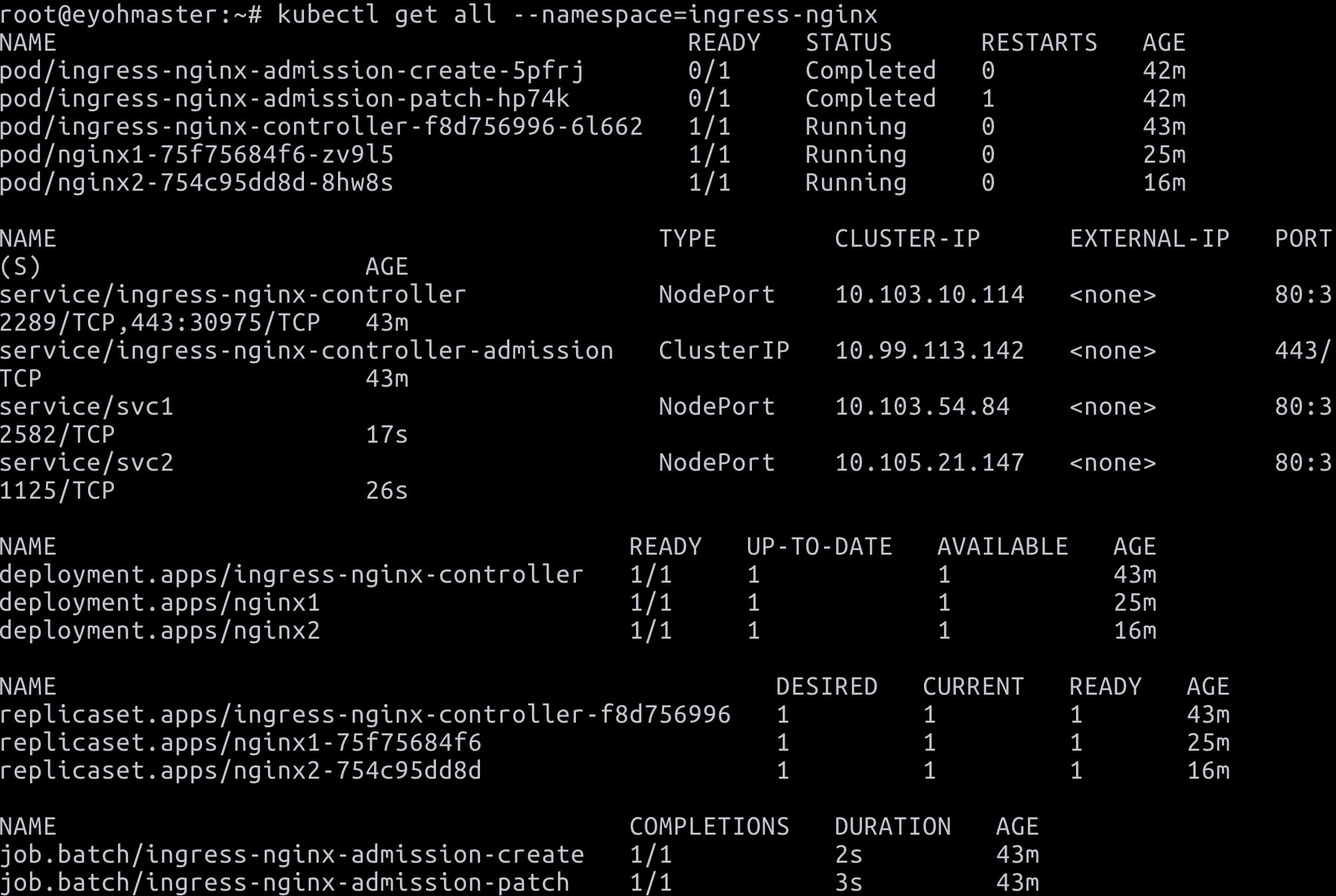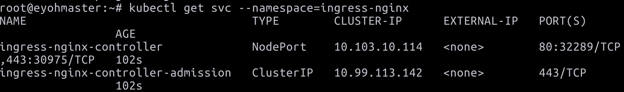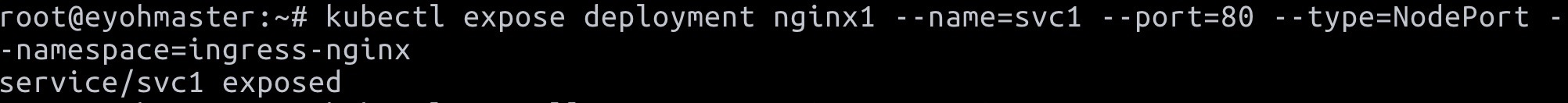 $ kubectl expose deployment nginx1 --name=svc1 --port=80 --type=NodePort --namespace=ingress-nginx