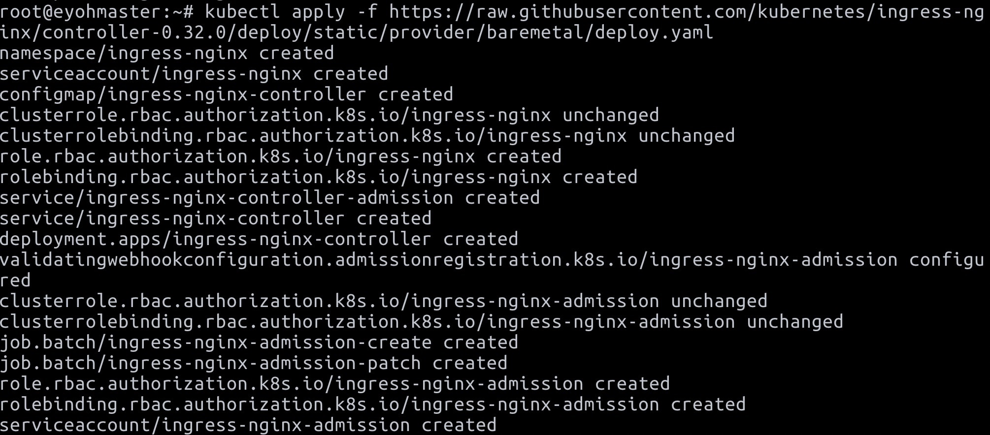 $ kubectl apply -f https://raw.githubusercontent.com/kubernetes/ingress-nginx/controller-0.32.0/deploy/static/provider/baremetal/deploy.yaml